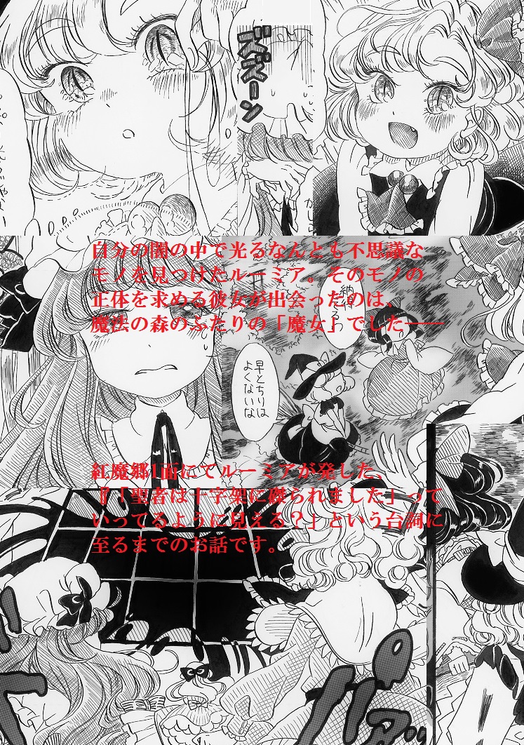 初めてのルーミア本です。紅魔郷1面で彼女が発した「聖者は十字架に磔られましたっていってるように見える?」という台詞の知識はいったいどこで、どのようにして得られたものなのか?を妄想爆発で解釈したお話になっています。
