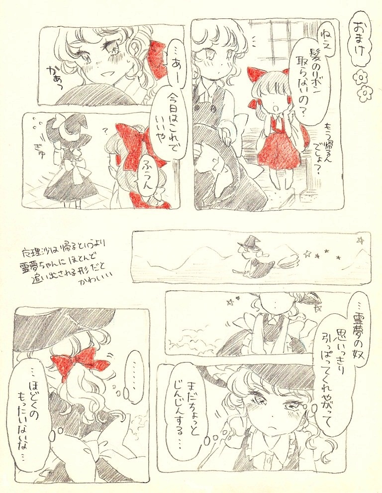 永夜抄の魔理沙ってリボン赤いじゃないですか。あのリボンは霊夢ちゃんにもらったからに他ならんだろ!という妄想からできた漫画です。どこまでもレイマリ脳…