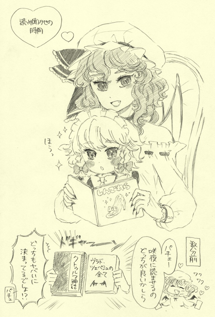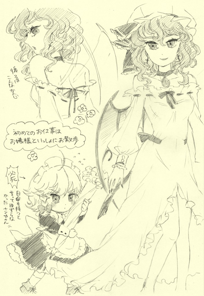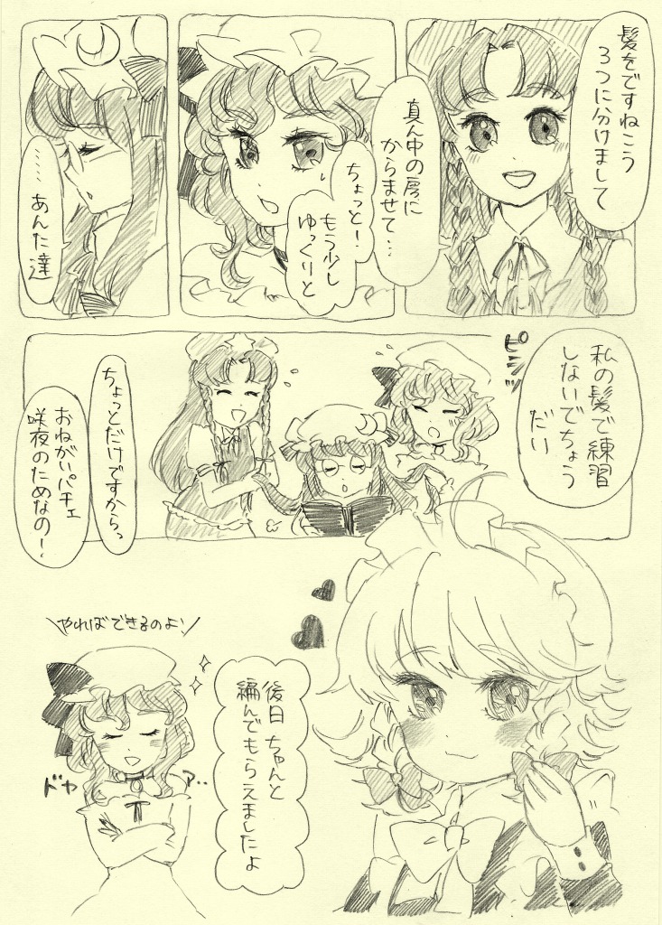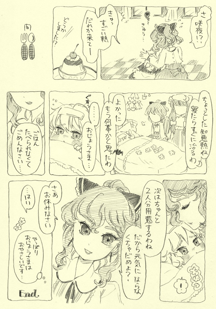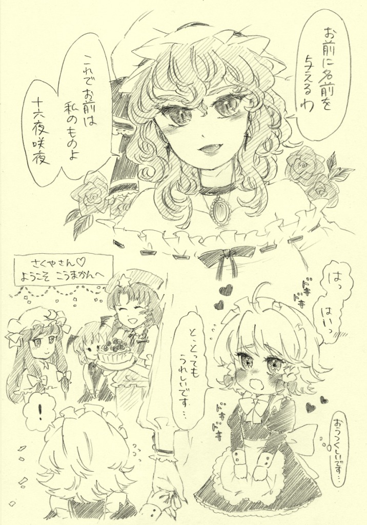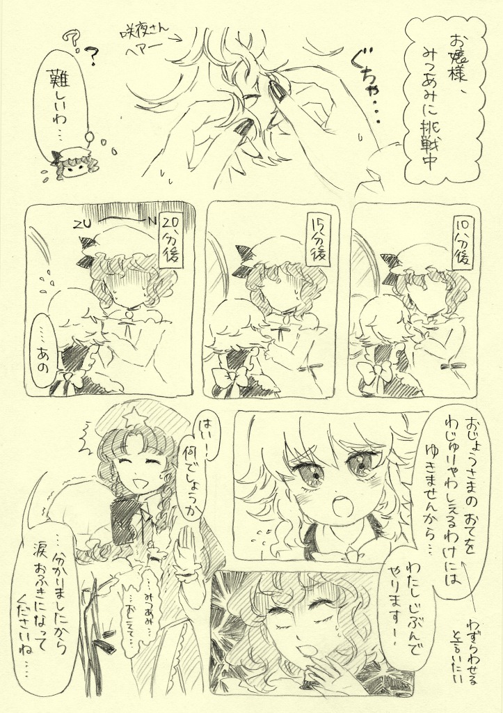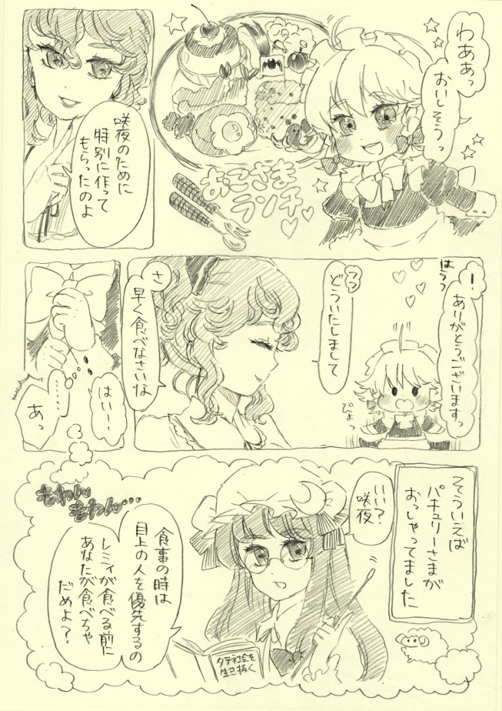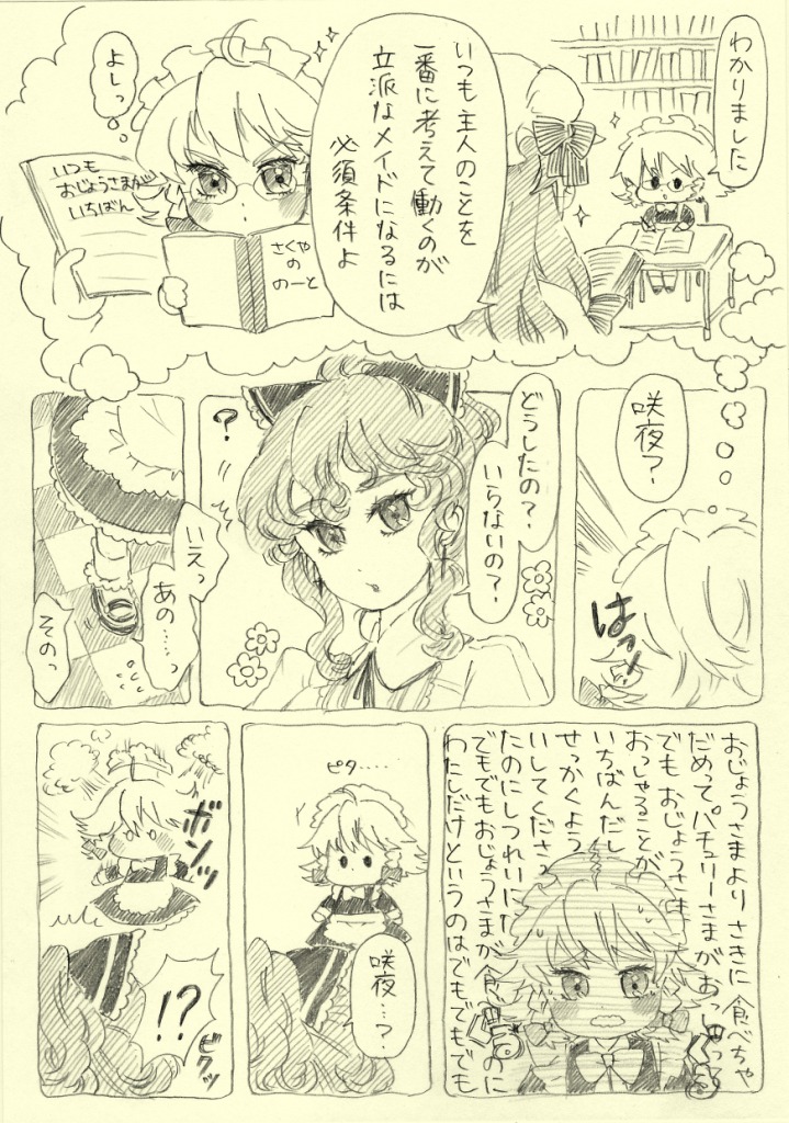 ちみっこ咲夜さんは吸血鬼と魔女と妖怪とにあったかく見守られながらバリバリのメイド長に成長したらいいなあと思うのです。品格とか物腰、レディとしての振る舞いはお嬢様から、知識はパチュリーから、体術や戦闘は美鈴から、といった具合に…もちろんスペルカードは3人がかりで教えられるので、5面と6面中ボスまでこなせるようになったなんて!ね!