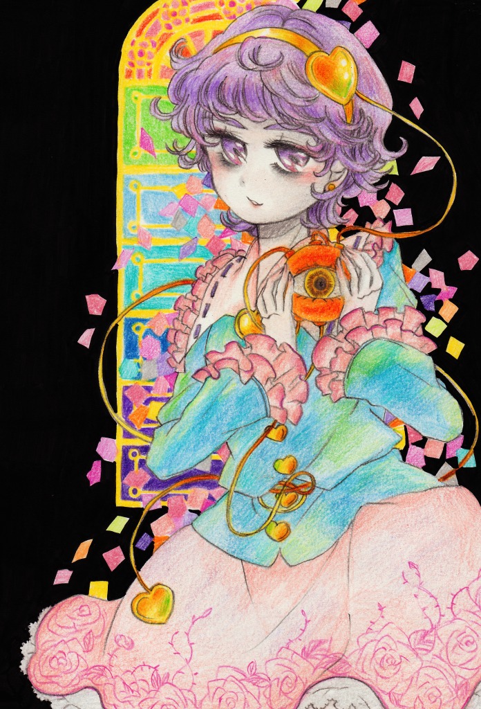 ツイッターでさとり様はクマが似合うよね~!不健康かわいい!ときゃっきゃしながら描いてました。地底のあんな暗いお屋敷で暮らしてたらいくら妖怪でも体に悪いような気がして…東方の女の子ってたくましくて割とみんな傍若無人なところがあるけど(褒めてるんだよ!)、健康そのもので元気はつらつ!て印象の子があんまりいないのも不思議。エネルギーがまた違う方向に行ってるとでも言えばいいのかな~…妖怪がいっぱいいるから、また人間とは異なるエネルギーが満ち満ちてるっていうのかな。そんな彼女たちが大好きです(´∀`)