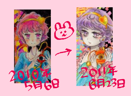 あとこれはお遊びっぽく並べてみたのですが、ちょうど一年くらい前にも似たような構図のさとりんを描いてたのでなんか変化でもあるだろーかと比べてみました。いやでもやっぱり過去の絵を見返すのはかなり精神力使うね…これはまだ一年前だから比較的マシだけど、それ以上前になると恥ずかしさがうごごごごっと…でもちょっとは成長してたらいいなあという欲目で見てみました。どうかな。