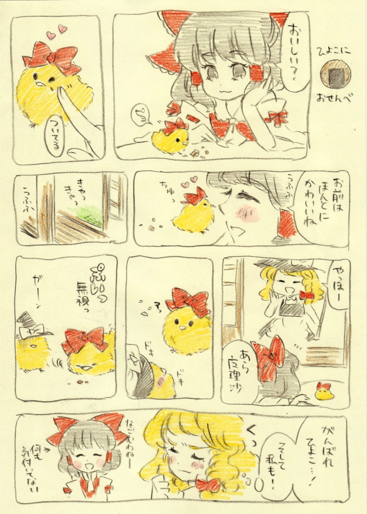少し前にツイッターのアイコンをひよこにしてそこからひよこレイマリ妄想がふつふつと沸いております…なにが言いたいかっていうとレイマリはひよこになってても可愛いという事です!ひよこ霊夢がひよこ魔理沙に興味が全然ないのは、人間の霊夢のことが大好きだからとそんなどうでもいい設定があったり。相手が動物であっても愛されいむにしちゃうのはもう私の癖としか言いようがないですね…霊夢ちゃんかわいいよ霊夢ちゃん